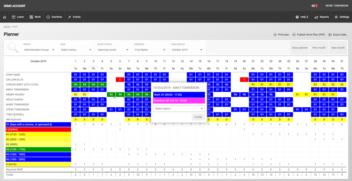 Equally, the system will flag when a shift pattern doesn’t work; either because someone is not contractually obliged to work that day, or – if the platform has a built-in holiday planning feature – the person has booked that day off as holiday or time off in lieu.